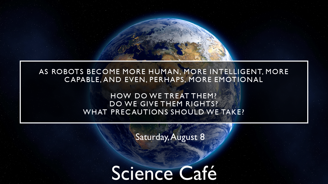 « All Events This event has passed. Science Cafe 08/08/2020 @ 10:00 AM - 11:00 AM PDT Free « Follow the Food Sunday Concert » This poll is no longer accepting votesYour three votes of favorite conversation topics for the Science Cafe today1. How to think like a scientist, and the value thereof 2. Climate change is here. What next? 3. Big Data and AI: the two heads Janus of our time 4. What is the best way to deal with those blinded by the Dunning-Kruger effect? 5. Why do we have such difficulty understanding probabilities? 6. The next or ideal 3D world 7. Why is teaching Math’s so hard? 8. Unexplained aerial phenomenon 9. The COVID-19 pandemic has brought about large, presumably temporary, decreases in carbon emissions worldwide. Can we make those decreases permanent? How would we do that? Can we make other permanent improvements to the Earth's ecosystems thanks to the pandemic? 10. As robots become more human, more intelligent, more capable, and even, perhaps, more emotional, how do we treat them? Do we give them rights? What precautions should we take? 6 votes · 14 answersVote Add to calendar Google Calendar iCalendar Outlook 365 Outlook Live Details Date: 08/08/2020 Time: 10:00 AM - 11:00 AM PDT Cost: Free Website: http://maps.secondlife.com/secondlife/The%20Science%20Circle/206/216/25 Venue The Lighthouse Café Organiser Team effort