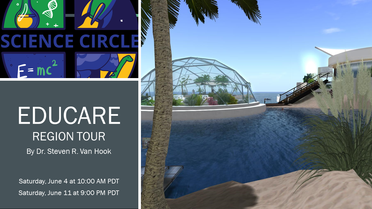 Think back on your first days in a virtual world: A confounding jumble of pop-up options blocking the scenery; embarrassing moments stuck bouncing off walls — that’s what we may recall. The Educare region provides a gentle first-time orientation for newcomers (and hesitant returnees) to explore VW education possibilities. For this ‘tour’ please land at […]